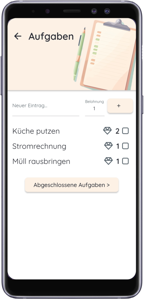 Für jede Aufgabe können Diamanten vergeben werden. Wer die Aufgabe erledigt, erhält die Diamanten! Damit nicht geschummelt wird, müssen abgeschlossene Aufgaben allerdings noch bestätigt werden.